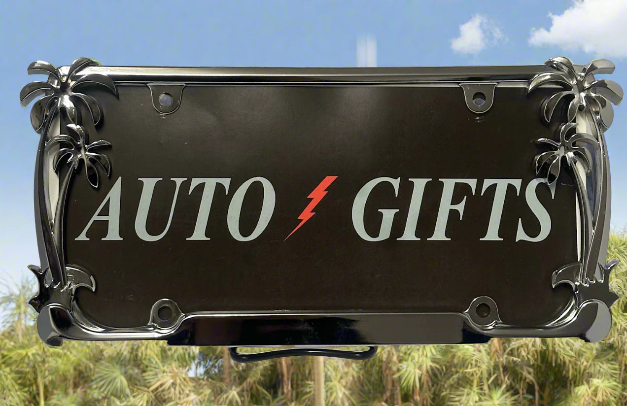 - A chrome frame featuring two palm trees on each side of the frame